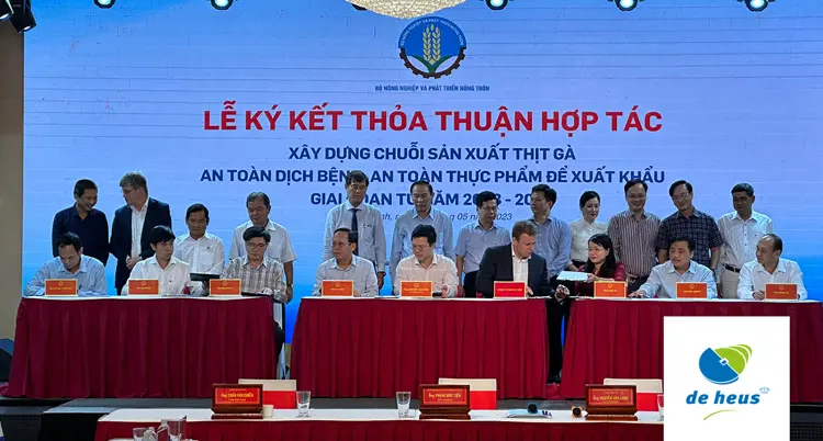 Ngày 11/05/2023 vừa qua, trong khuôn khổ của “Hội nghị triển khai xây dựng chuỗi, vùng chăn nuôi an toàn dịch bệnh” được tổ chức tại Tây Ninh, dưới sự chứng kiến của Thứ trưởng Bộ NN-PTNT Phùng Đức Tiến, De Heus cùng đại diện lãnh đạo Sở NN-PTNT các tỉnh nằm trong vùng kinh tế trọng điểm phía Nam đã tổ chức ký kết thỏa thuận hợp tác xây dựng chuỗi sản xuất thịt gà an toàn dịch bệnh, an toàn thực phẩm để xuất khẩu giai đoạn 2023 - 2028.