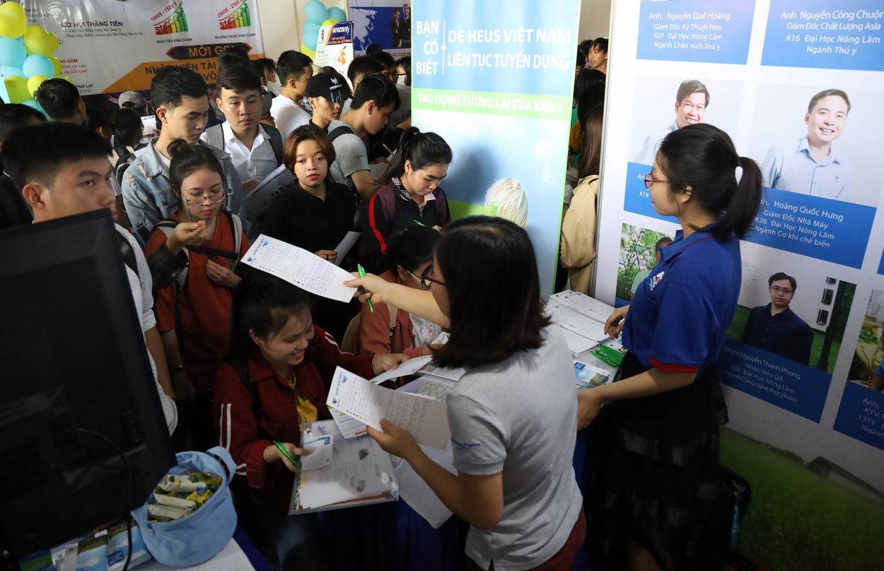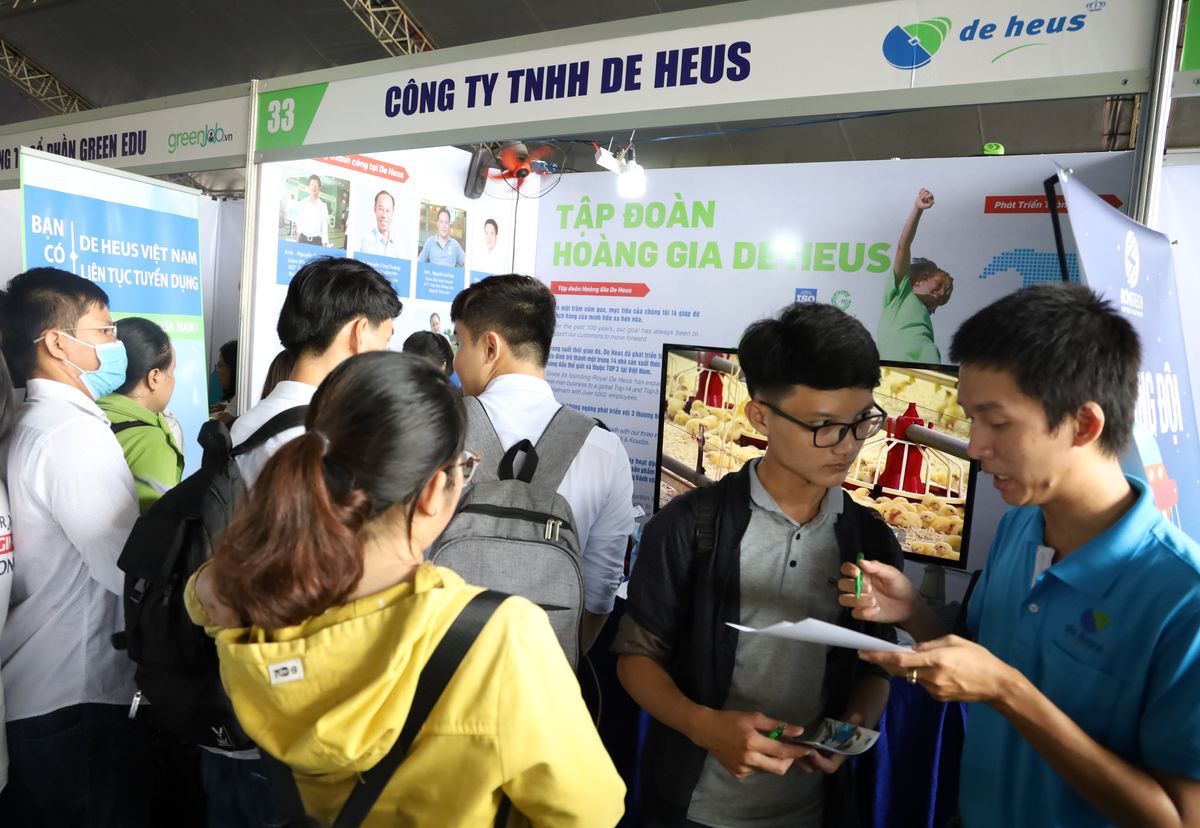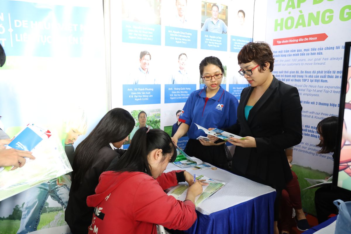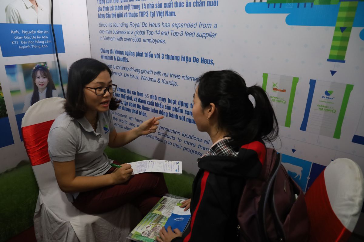Cũng tại ngày hội, công ty TNHH De Heus đã có gian hàng tham dự, nơi có nhiều sinh viên, người lao động đăng ký dự tuyển, cô Hoàng Thị Tuyết Minh – phụ trách tuyển dụng của công ty chia sẻ, hàng năm tại các trường đại học Nông Nghiệp trên cả nước có tổ chức ngày hội việc làm, chúng tôi điều tham gia và tuyển dụng được nhiều vị trí, đáp ứng được nhu cầu công việc. Tuy nhiên, vì De Heus là một công ty đến từ Hà Lan nên sự tuyển chọn, ngoài chuyên môn, cần phải giỏi Anh ngữ, công nghệ tin học, kỹ năng giao tiếp xã hội….