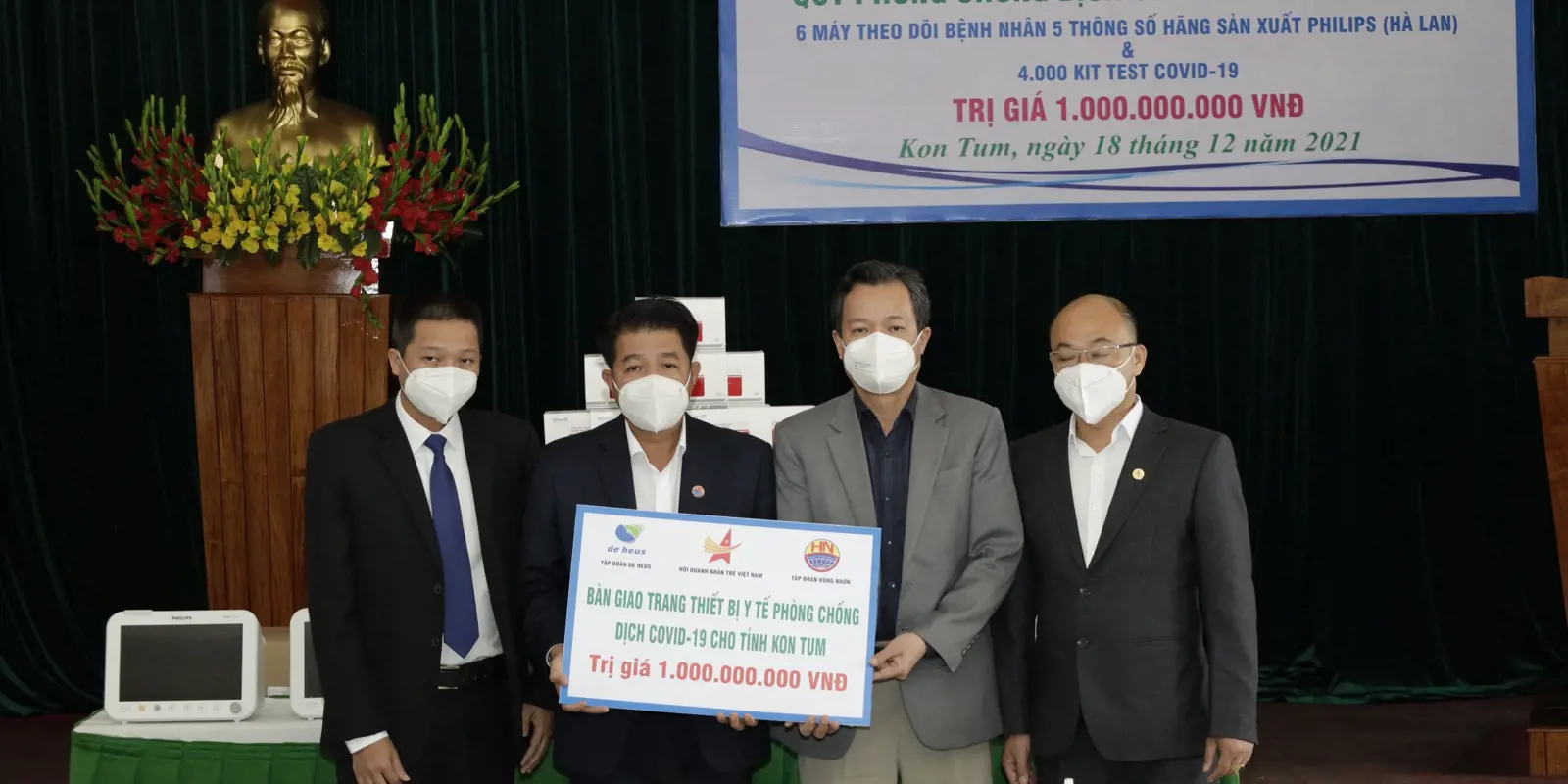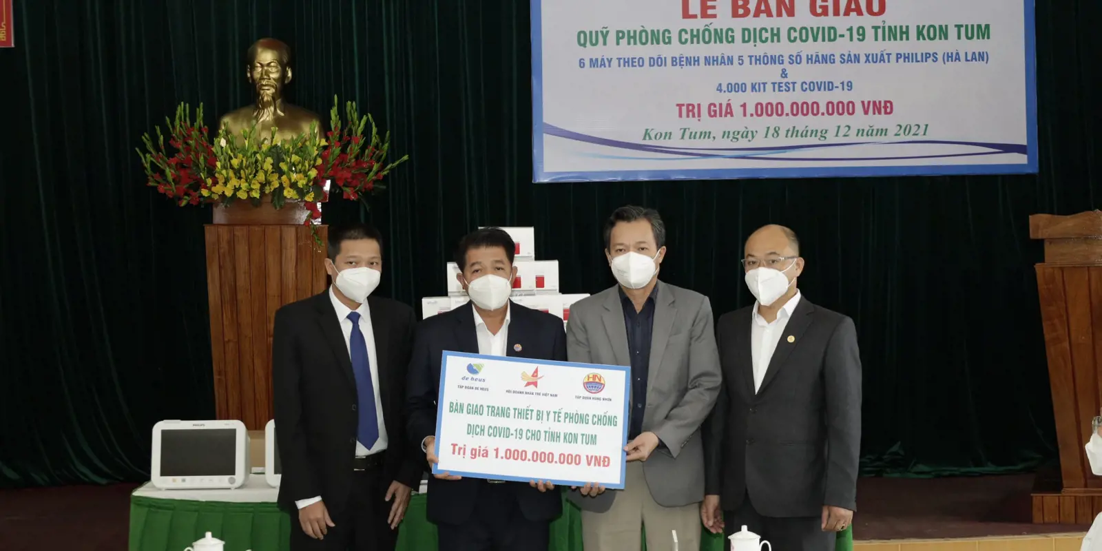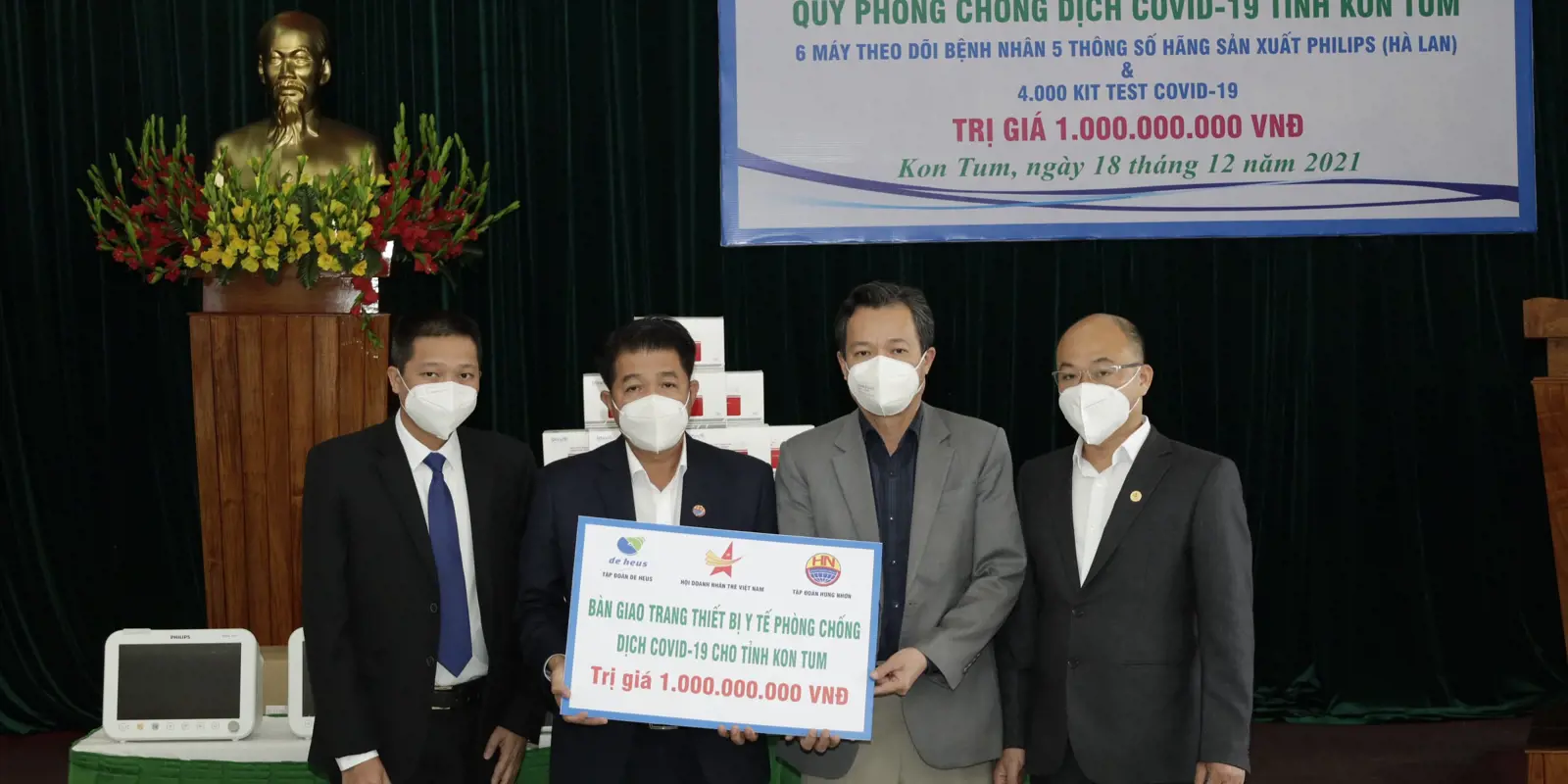 Tại buổi lễ bàn giao, Tập đoàn De Heus và Tập đoàn Hùng Nhơn cùng các đối tác đã trao tặng 6máy Monitor hiệu Philips của Hà Lan để theo dõi bệnh nhân với 5 thông số và 4.000 Kit test cho Quỹ phòng chống Covid-19 của tỉnh Kon Tum, với tổng số tiền là 1 tỷ VNĐ đồng.